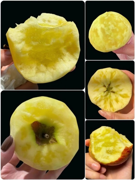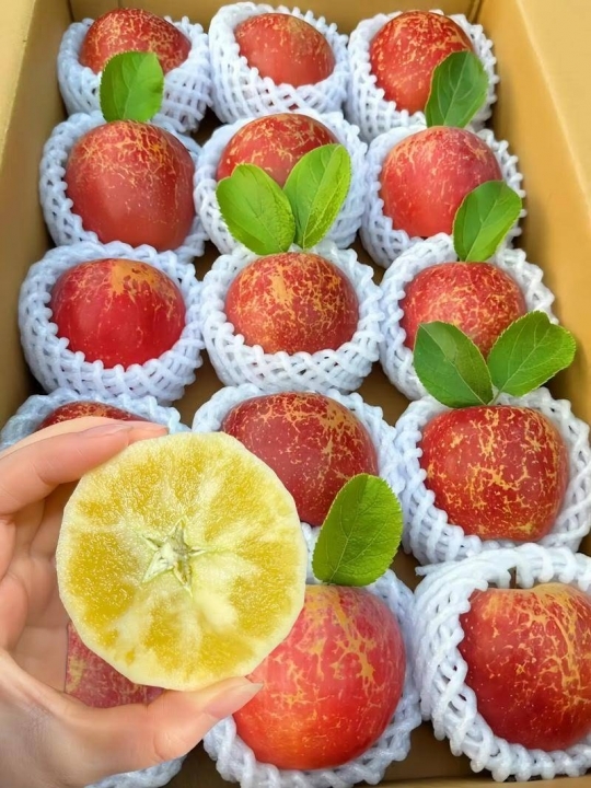 因生长在海拔2200米以上的高原,昼夜温差达15℃以上,糖分积累形成晶莹的\\"冰糖心\\",糖度普遍超过16度。切开后果核附近可见蜂蜜状结晶,甜味浓郁自然,远超普通苹果。